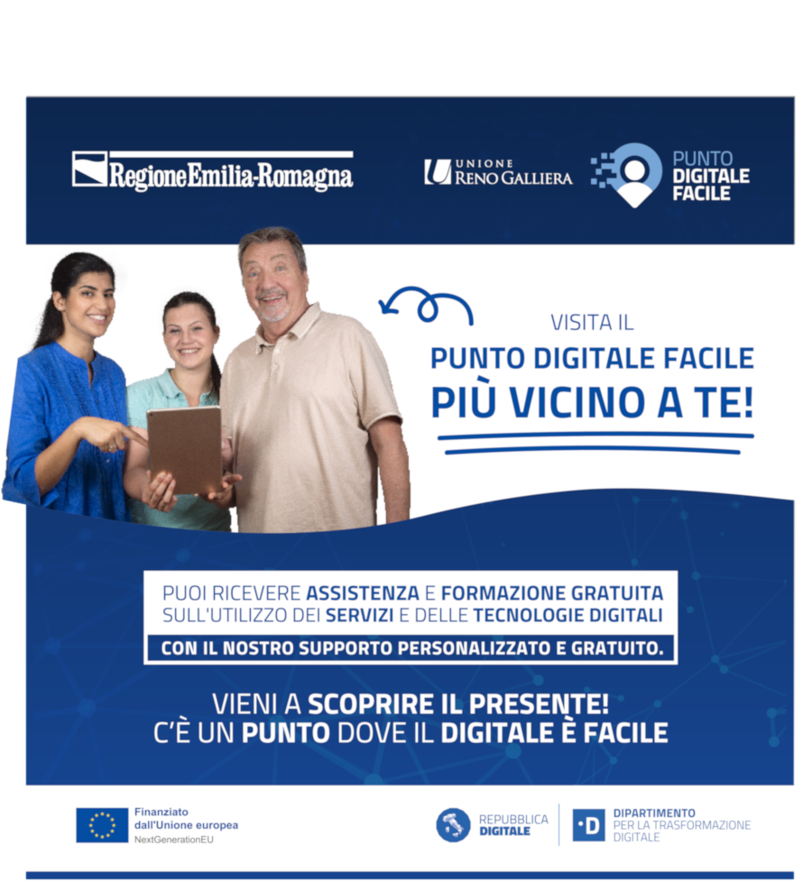 L’Unione Reno Galliera, nell’ambito del progetto nazionale Digitale Facile, ha sviluppato un servizio di supporto individuale per affiancare i cittadini nella risoluzione di problemi con la tecnologia informatica. L’obiettivo è quello di migliorare le competenze di chi ha difficoltà con smartphone, computer o altri apparati, e rendere il digitale più familiare. Alcuni esempi? uso del Fascicolo Sanitario Elettronico, iscrizione e gestione dello SPID, servizi del Portale INPS, pagamento delle bollette online... e tanto altro ancora!
