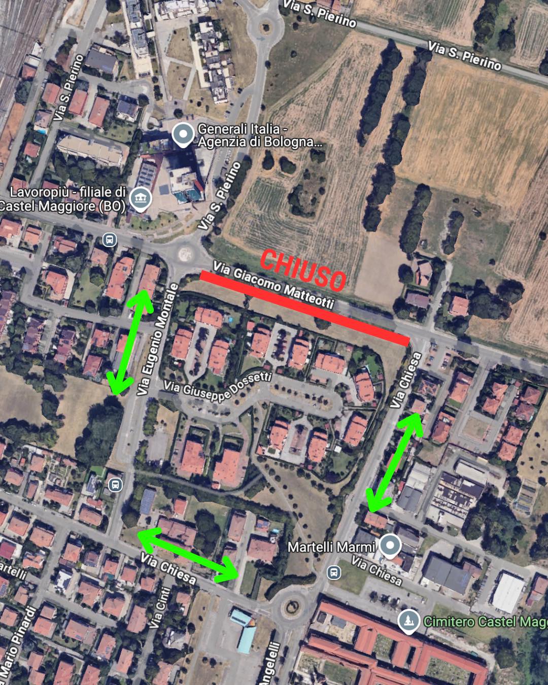 - via Matteotti, nel tratto tra la rotatoria Montale-San Pierino (Grattacielo) e Via Chiesa (Cimitero), è chiusa al traffico con deviazione del traffico su Via Montale e via Chiesa. In via Chiesa viene istituito il divieto di sosta con rimozione formata e divieto di fermata sul lato numeri civici pari (quello della chiesa di S.Andrea).
