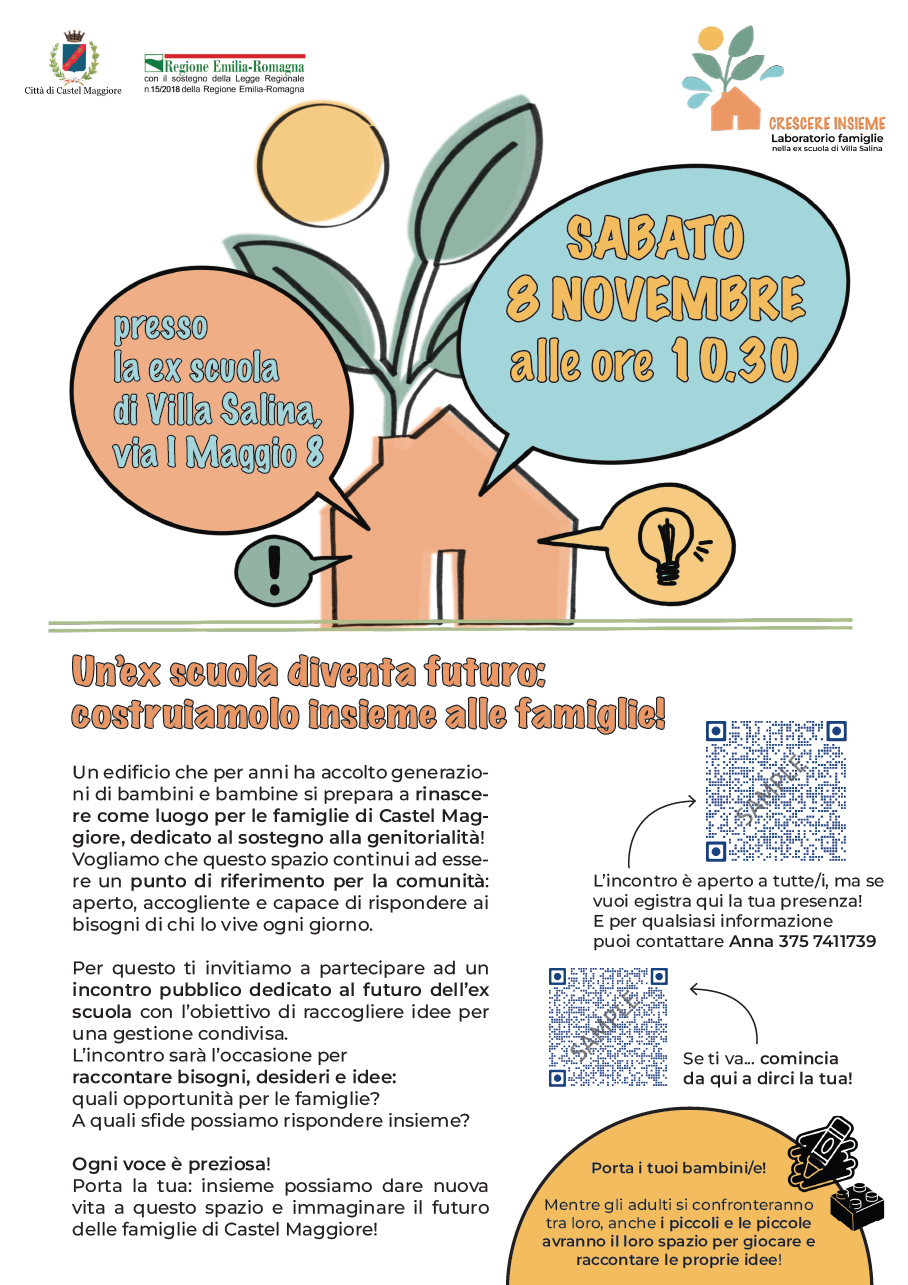Un’ex scuola diventa futuro: costruiamolo insieme alle famiglie! Questo è l’invito aperto a tutta la cittadinanza, con chiamata speciale per le le famiglie e i soggetti che si occupano di infanzia ed adolescenza, per sabato 8 novembre alle 10.30: un incontro che si svolgerà proprio presso la ex scuola dell’infanzia Villa Salina - in via I Maggio 8 a Castel Maggiore - un luogo che per anni ha accolto generazioni di bambini e bambine e che si prepara a rinascere come spazio per le famiglie di Castel Maggiore, e sarà dedicato al sostegno alla genitorialità ma non solo.
