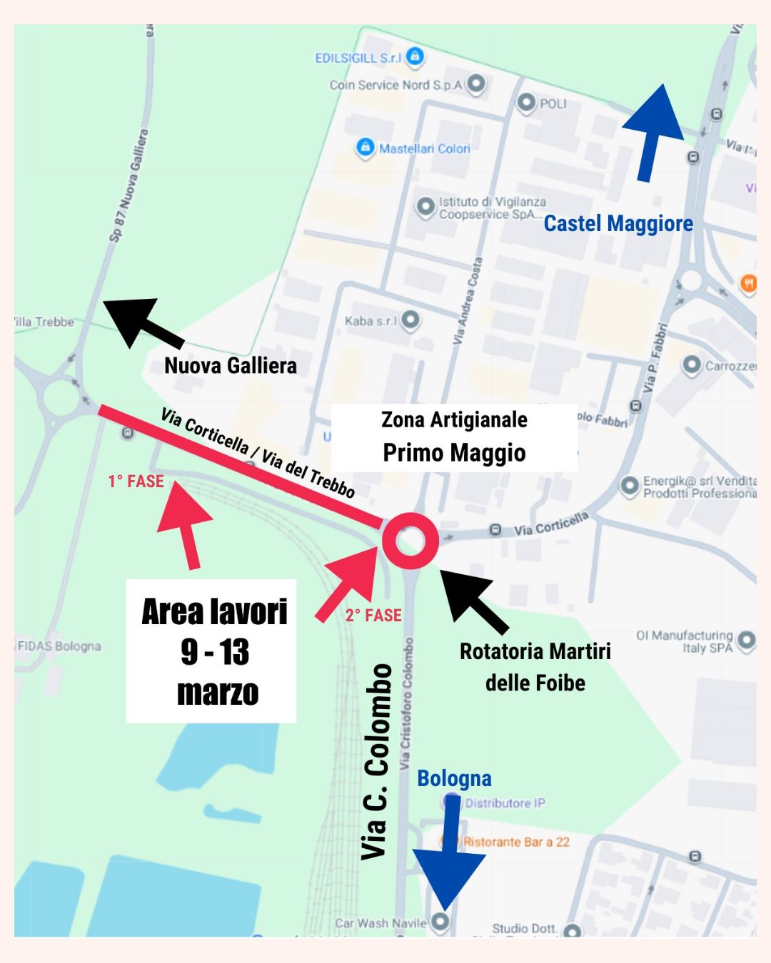 A partire da lunedì 9 marzo verranno effettuati lavori urgenti di rifacimento del manto di asfalto del tratto di strada di via Corticella/via del Trebbo compreso tra la rotatoria di immissione nella SP 87 Nuova Galliera e la rotatoria Martiri delle Foibe, dove si immette via Cristoforo Colombo, in collaborazione tra il Comune di Castel Maggiore e il Comune di Bologna.