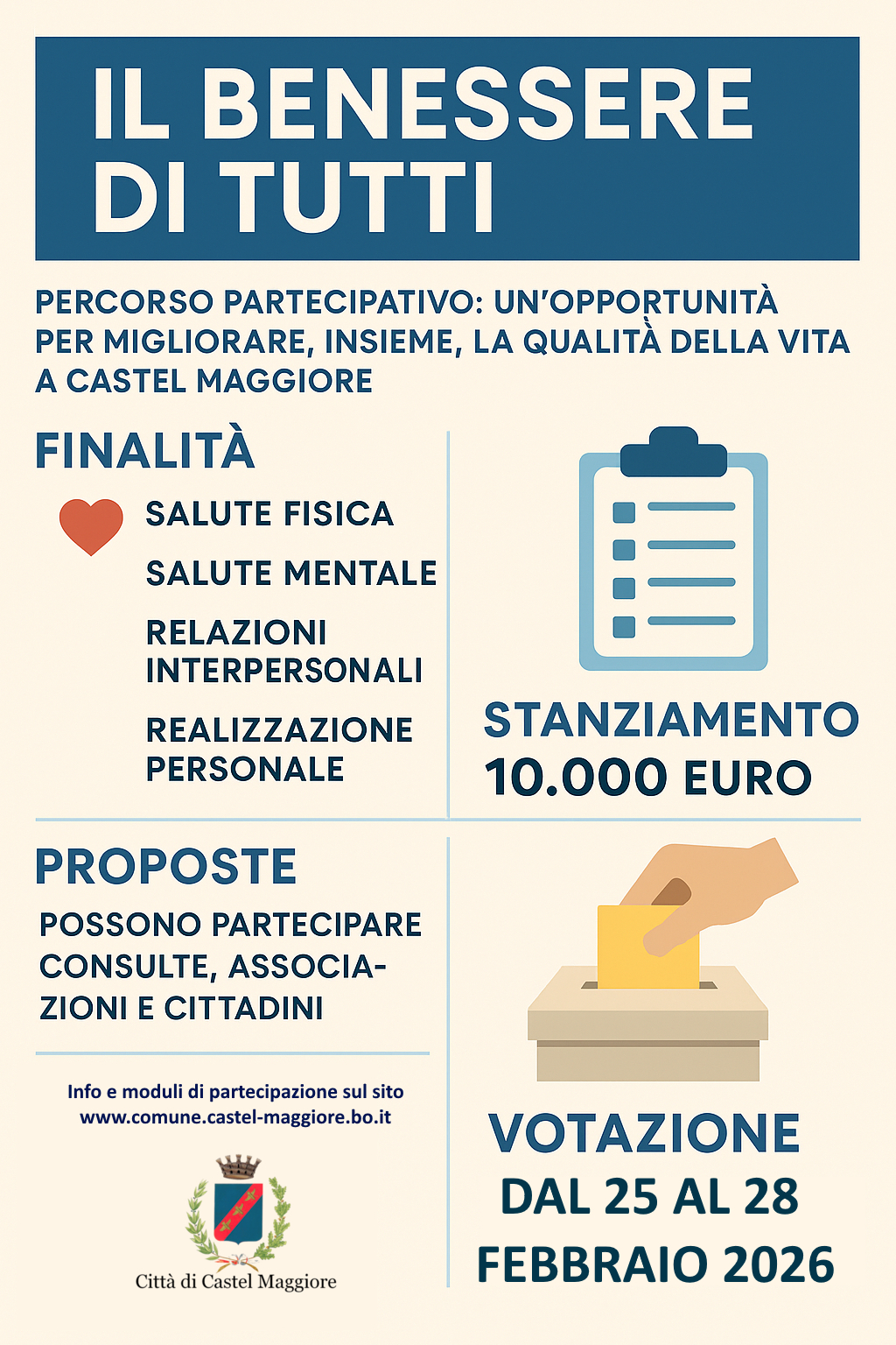 I progetti ritenuti idonei saranno pubblicati sul sito del Comune e sottoposti a votazione pubblica, che si svolgerà dal 25 al 28 febbraio 2026.