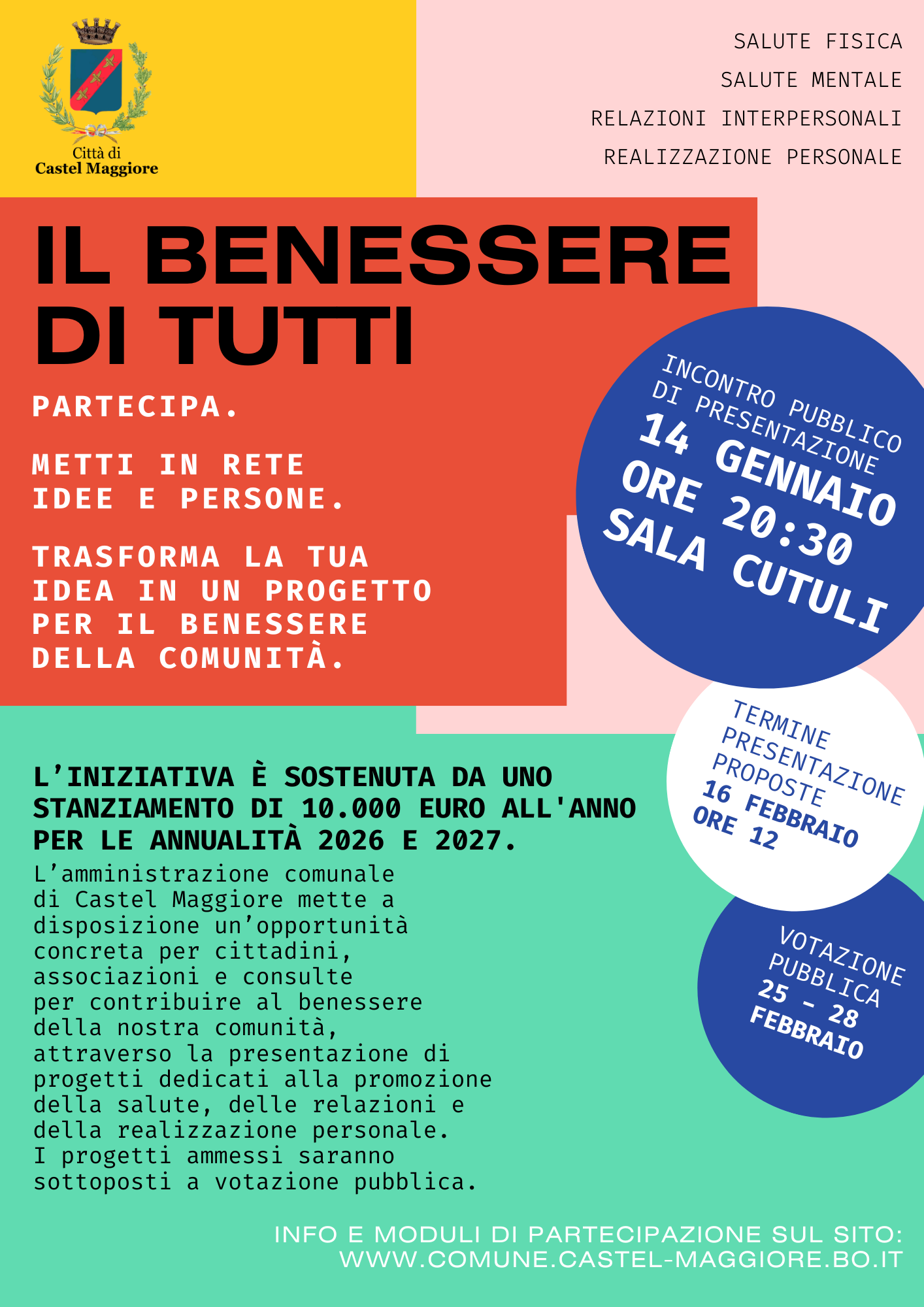 L’amministrazione comunale di Castel Maggiore mette a disposizione un’opportunità concreta per cittadini, associazioni e consulte per contribuire al benessere della nostra comunità, attraverso la presentazione di progetti dedicati alla promozione della salute collettiva. L’iniziativa è sostenuta da uno stanziamento di 10.000 euro all'anno per le annualità 2026 e 2027.