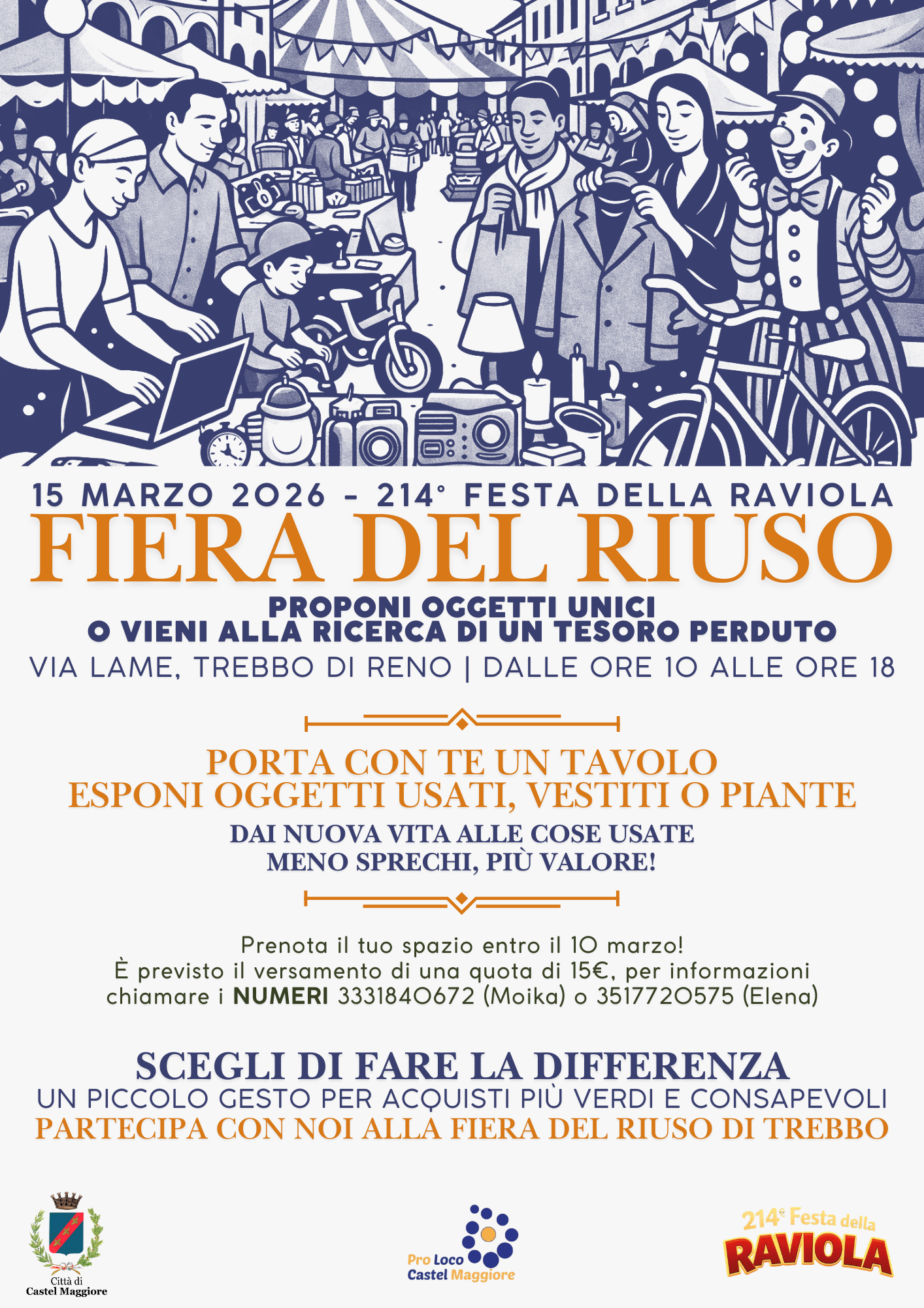Nell'ambito della 214^ Festa della Raviola, domenica 15 marzo dalle 10.00 alle 18.00 si terrà la Fiera del Riuso: