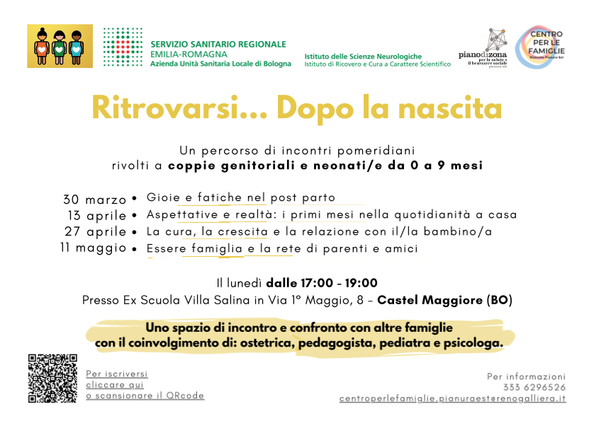 Uno spazio di incontro e confronto con altre famiglie con il coinvolgimento di: ostetrica, pedagogista, pediatra e psicologa.