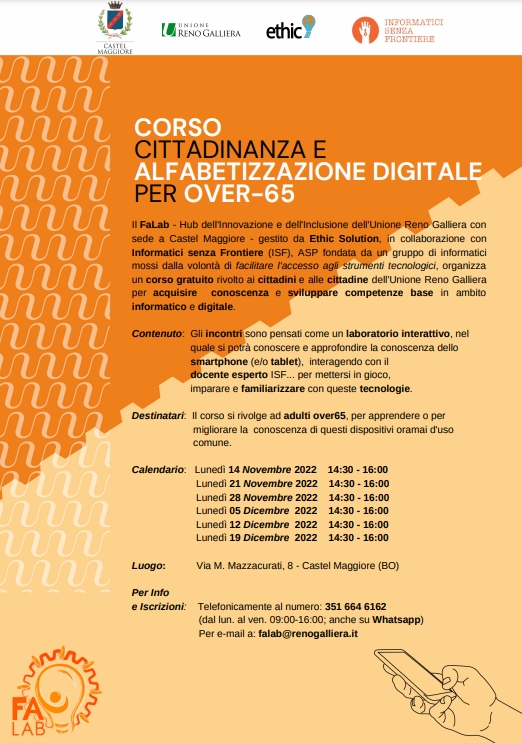 Il FaLab dell’Unione Reno Galliera è un hub dell'innovazione e dell'inclusione, ha sede a Castel Maggiore ed è gestito da Ethic Solution, che per questo progetto si è avvalso della collaborazione di Informatici senza Frontiere (ISF), ASP fondata da un gruppo di informatici mossi dalla volontà di facilitare, a tutti, l'accesso a strumenti tecnologici e dispositivi digitali oramai d'uso comune.