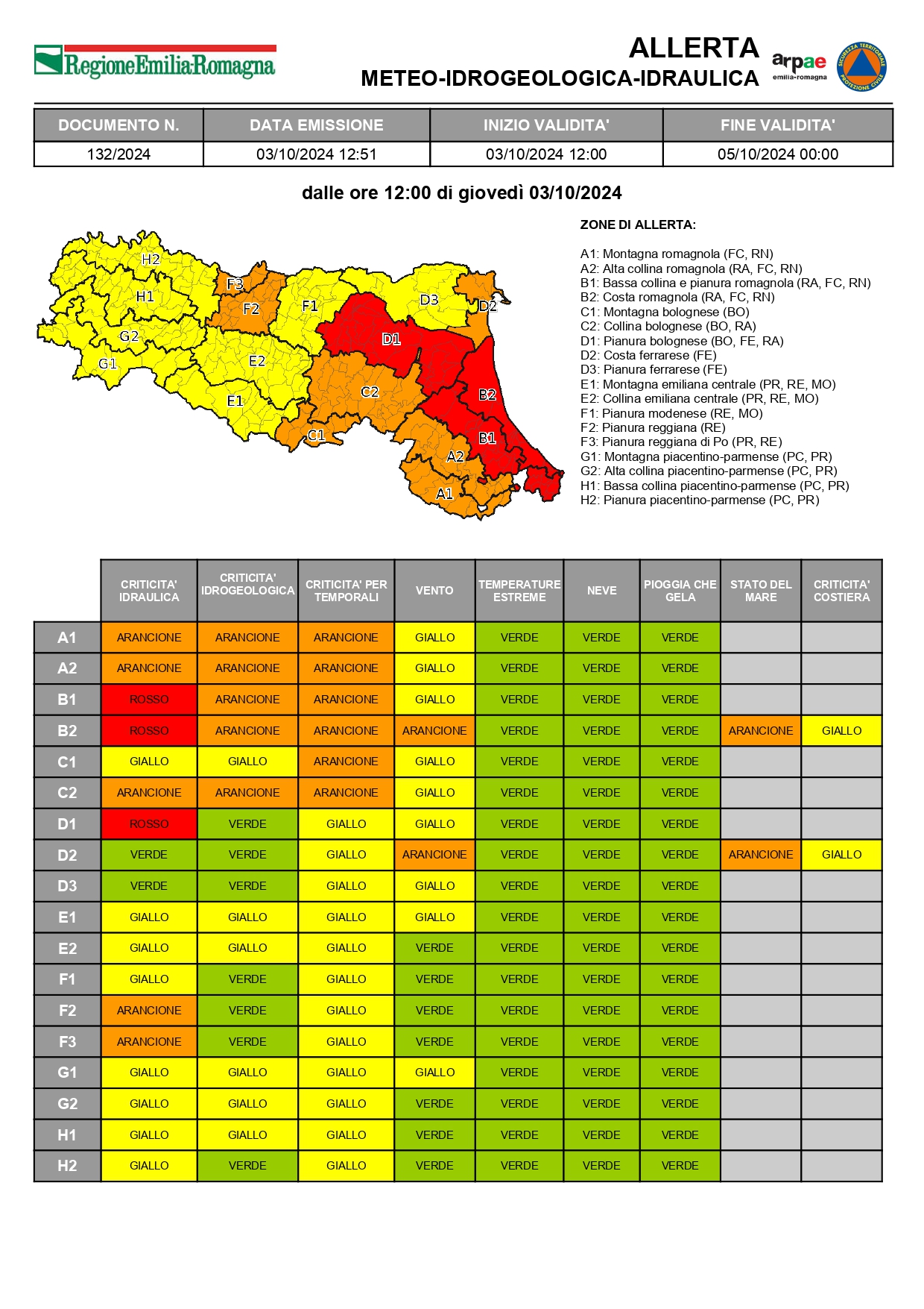 Nella giornata di giovedì 3 ottobre sono previste dalla mattina precipitazioni diffuse e localmente intense, anche a carattere di rovescio temporalesco su tutta la regione. I fenomeni risulteranno in ulteriore intensificazione dalle ore pomeridiane, in particolare sulle aree appenniniche centro-orientali e sulla pianura romagnola. Le precipitazioni previste potranno generare, in particolare nell'appennino centro-orientale, fenomeni di ruscellamento sui versanti, fenomeni franosi, favoriti da condizioni di saturazione dei suoli abbastanza elevate. Si prevedono rapidi innalzamenti dei livelli idrometrici sui corsi d'acqua del settore centro-orientale che, a partire dalle ore pomeridiane, potranno superare le soglie 2. Dalle ore pomeridiane sono anche previsti venti nord-orientali di burrasca forte (75-88 km/h) sulle aree costiere e venti di burrasca moderata (62-74 km/h) sul restante settore centro-orientale, con possibili rinforzi o raffiche di intensità superiore. La ventilazione renderà il mare agitato al largo, con altezza dell’onda superiore a 3.2 metri e, sotto costa saranno possibili localizzate erosioni, inondazioni del litorale e difficoltà di deflusso delle piene in mare.