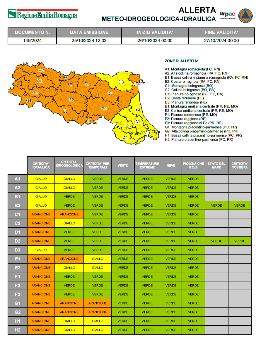 La zona della pianura bolognese (D1) è interessata da un'allerta arancione per criticità idraulica.