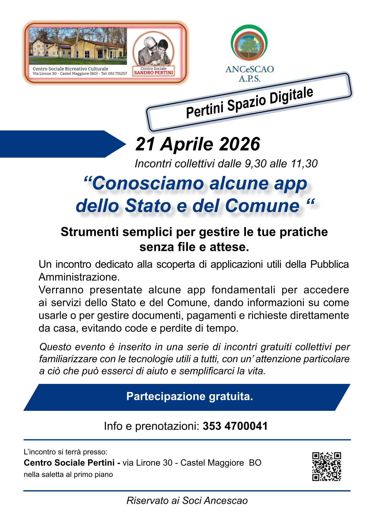 Verranno presentate alcune app fondamentali per accedere ai servizi dello Stato e del Comune, dando informazioni su come usarle o per gestire documenti, pagamenti e richieste direttamente da casa, evitando code e perdite di tempo.