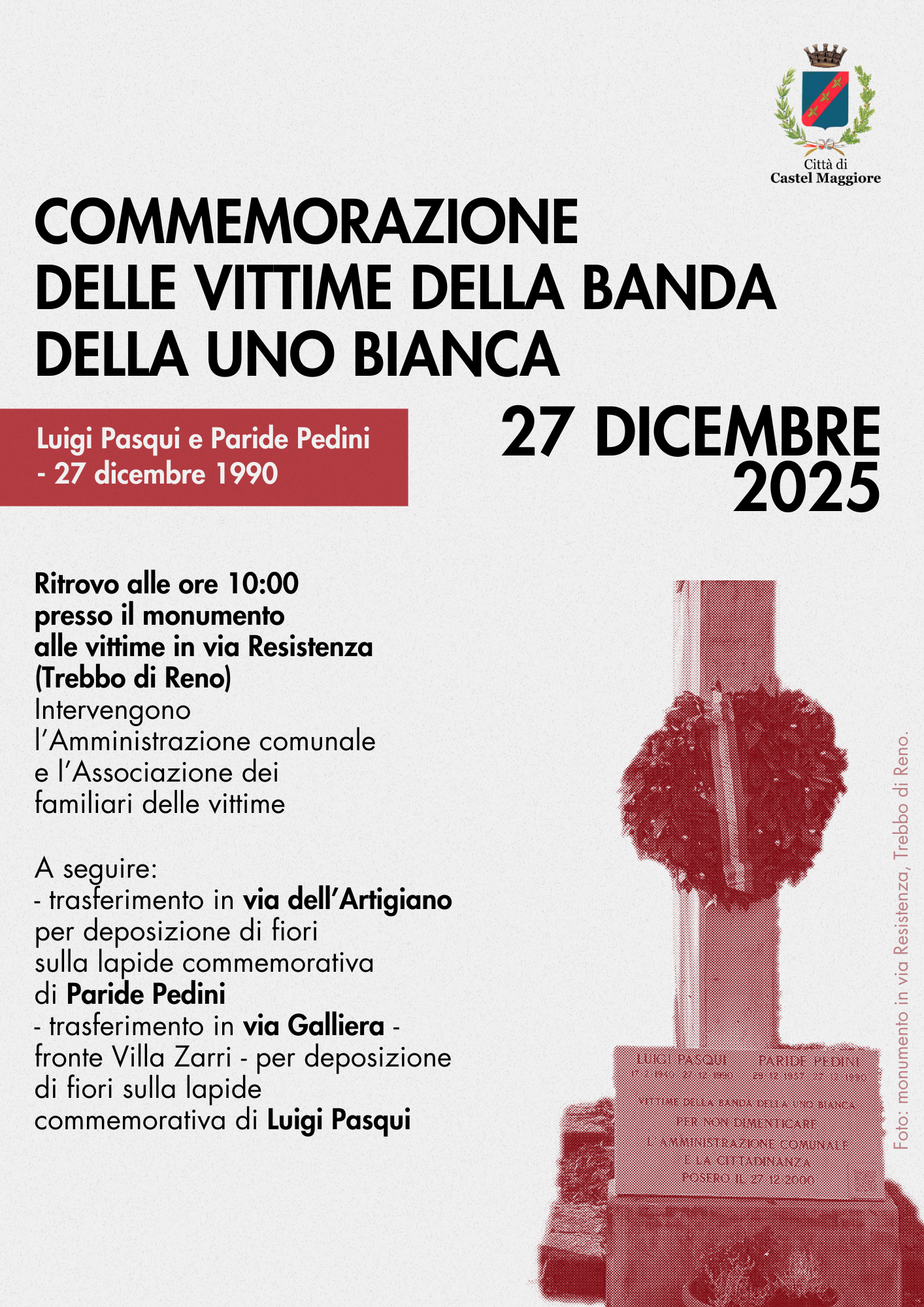 L'omaggio alla memoria di Luigi Pasqui e Paride Pedini, vittime della “banda della uno bianca”, si tiene nel 34° anniversario della scomparsa, sui luoghi dove il 27 dicembre 1990 i due cittadini di Castel Maggiore furono assassinati: presso la stazione di servizio sulla Provinciale Galliera, dove Luigi Pasqui fu freddato al termine di una rapina, e a Trebbo di Reno, davanti all'abitazione di Pedini, sfortunato testimone del cambio di vettura da parte dei banditi.
