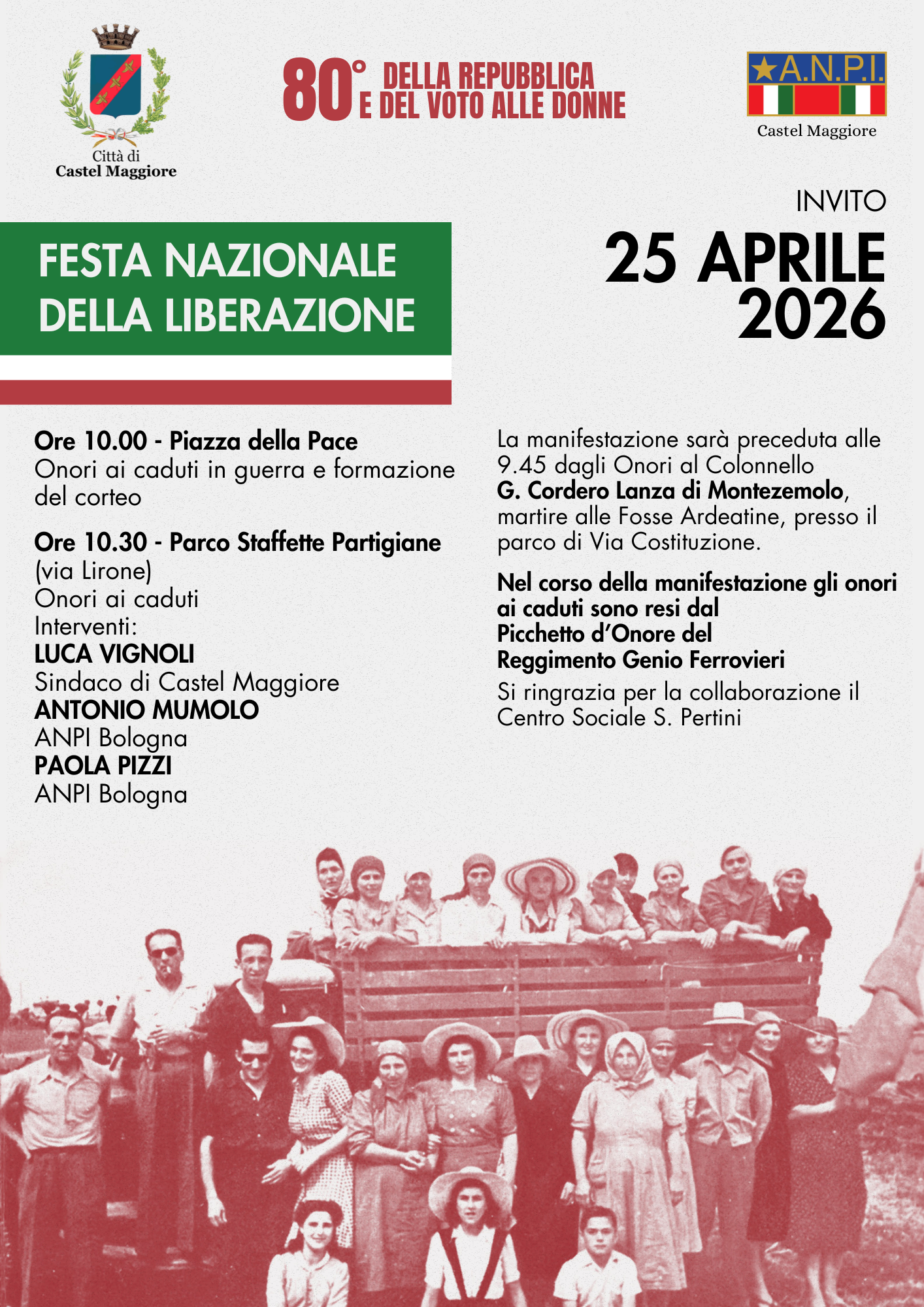 La manifestazione sarà preceduta alle 9.45 dagli Onori al Colonnello G. Cordero Lanza di Montezemolo, martire alle Fosse Ardeatine, presso il parco di Via Costituzione.